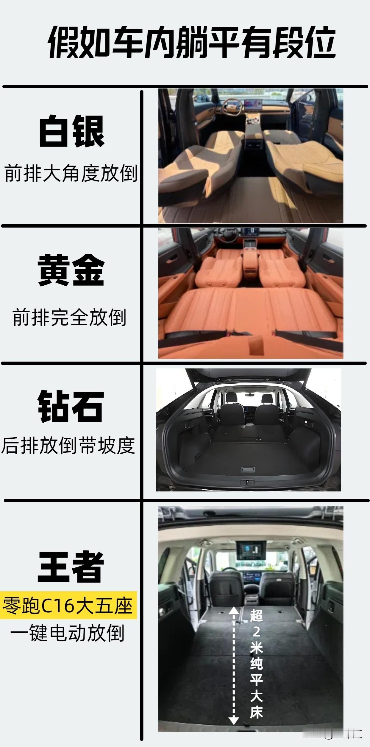2026款零跑C16上市,升级了个五座版? 6月18日,2026款C16正式上市,售价15.18-18.18万元,价格优势依旧明显,同时品质也进行了再次进阶,并且除了六座版之外,还新增了五座版。 两个版本在外观上没有太大区别,并且同样配备了激光雷达、全新车机系统和车载冰箱等配置,续航也是纯电版630km,增程版纯电续航280km。最大的不同之处是内部布局,五座版采用常规大五座的座椅布局,并做到了同级最优的二排空间。二排腿部空间961mm,坐高345mm,座椅最大靠背角140度,乘坐舒适感可想而知。 这还没完,五座版还有一键大床模式,拔出前排头枕后只需一键或语音控制,就可将前排座椅放平,与二排座椅形成一张大床。这功能对于想要午休的上班族来说,再合适不过了。它还有二排折叠成床、单侧折叠成床等多种模式,总之,百变空间总有一种适合你。 此外,26款C16五座版还标配了21扬声器、后排15.6英寸吸顶大屏、后排十点按摩等同级唯一配置,并可随时开启一键观影模式,带来的体验可以说远超同级。 所以总结来看,26款C16是家庭的不二之选,六座适合大家庭,而五座则更适合小家庭。而且现在新车上市还有补能礼、选装礼、流量礼等权益,下半年想买家用SUV的,这款车值得考虑。 零跑c16 零跑汽车