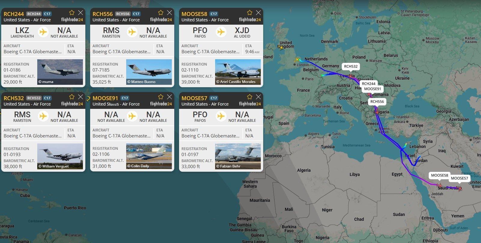 伊以冲突 美军运输机群向沙特基地的大规模空运仍然在持续。