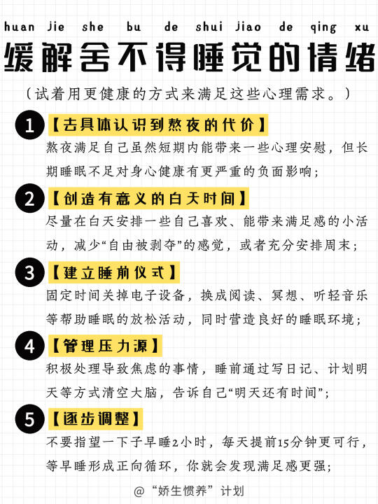 总舍不得睡觉其实是一种心理问题; 有时候就算意识到自己该睡觉了; 但就是会忍不住拖延熬夜; 即使完全不知道干什么; 也会莫名其妙的舍不得睡觉熬到很晚;