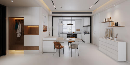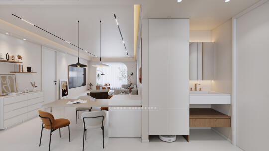 改造二:餐厅位置,打掉餐厅挨着客卫的墙,干区移位后,这边变成客卫步入过道,餐桌就可做成餐岛一体。(见上图)