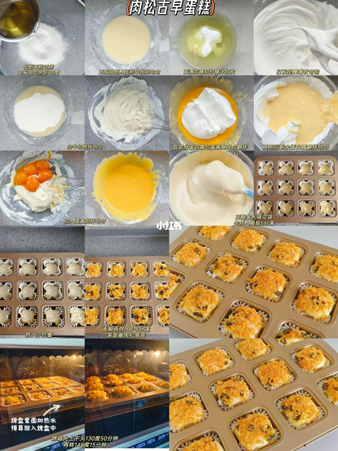 2.烤箱预热。冷冻蛋清加糖和柠檬汁打发,直到打蛋头出现如图鹰嘴状弯钩,取三分之一蛋白霜与蛋黄糊翻拌均匀,再倒回剩余的蛋白霜里面继续翻拌均匀,装入裱花袋,先挤入纸杯模具5分满,中间挤沙拉酱,面糊再继续挤入8分满,表面撒海苔肉松。