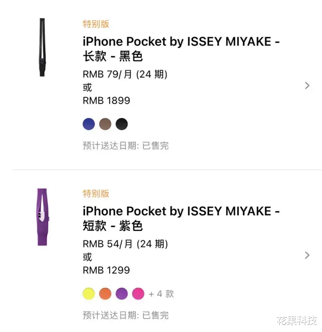 但万万没想到的是,今天 iPhone Pocket 正式开售后没过多久就直接售罄了,目前长款和短款的所有配色都的显示「已售完」状态。