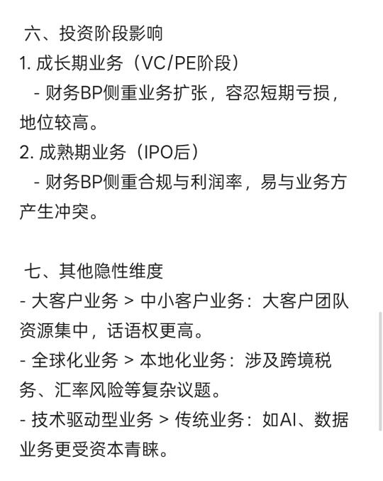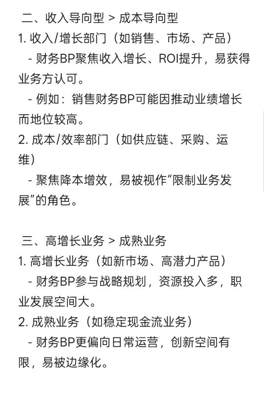 - 例如:销售财务BP可能因推动业绩增长而地位较高。