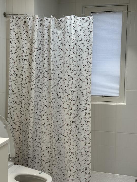 卫生间淋浴区的挡水方案想了很久 决定还是浴帘,不仅轻便还易于更换 宜家这款小碎花实物更美哎 特意选了钢丝绳轻巧不会太显眼 我挂的稍低了一些 这样正好可以挡水 也可以离地几公分看个人习惯啦 -
