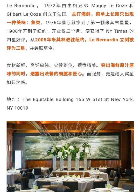 纽约顶 级 海鲜餐厅 Le Bernardin,也是各大榜单的钟爱。不仅连续多年蝉联米其林三星,拿下过 Zagat 评选的纽约zui佳餐厅,也长年跻身 World Best 50,去年排名71名,今年遗憾跌至90名