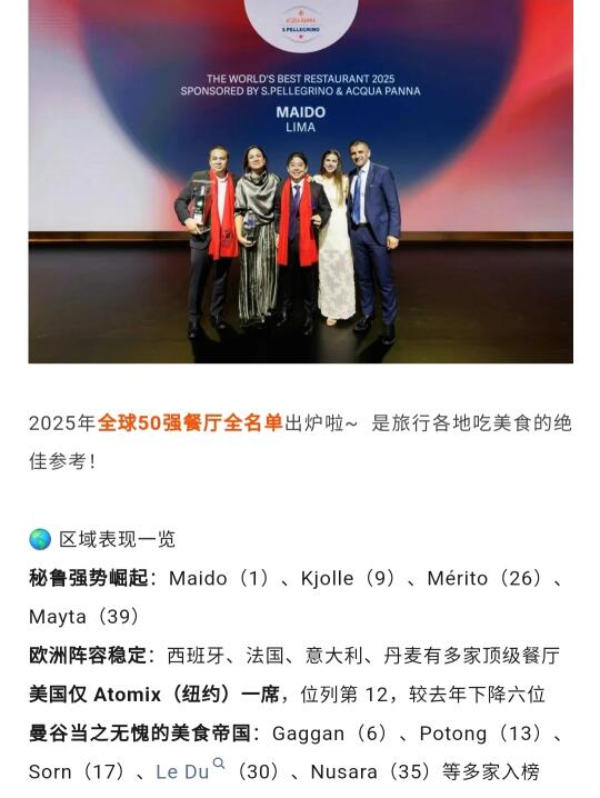 吃货喜讯!2025年 World Best 50 Restaurant 全球50强餐厅的评选,在本月初(6月19日)火热出炉啦!