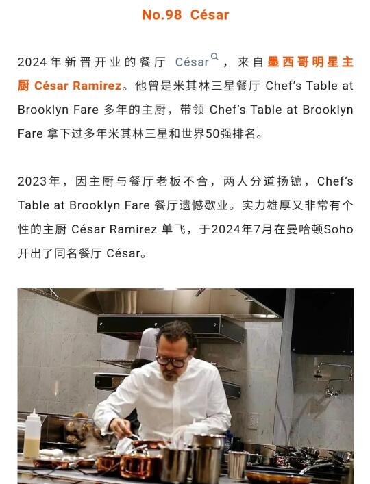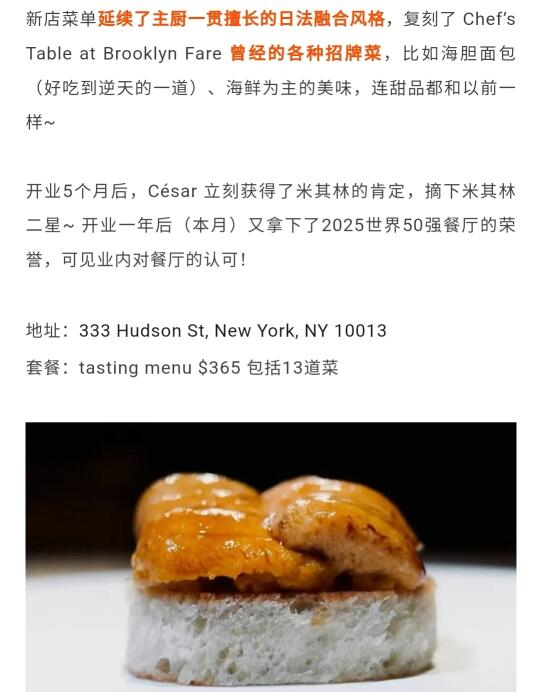2024年新晋开业,来自墨西哥明星主厨 César Ramirez。他曾是米其林三星餐厅 Chef’s Table at Brooklyn Fare 多年的主厨,2023年单飞后开出了同名餐厅 César
