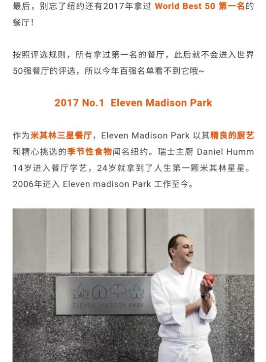 别忘了纽约还有2017年拿过 World Best 50 第1名的餐厅!按照评选规则,每年拿下榜单排名第1的餐厅,将会进入 The Best of the Best 精英榜单,此后不会再参加评选呢~