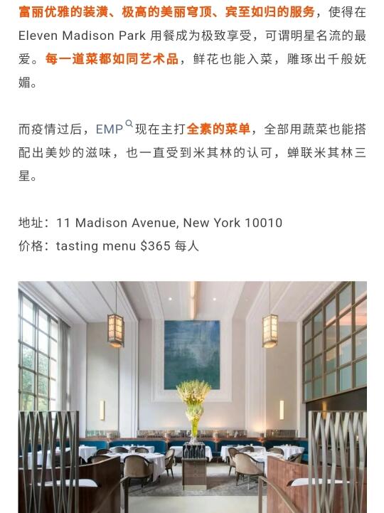 作为米其林三星餐厅,EMP 以其精良的厨艺和精心挑选的季节性食物闻名纽约。瑞士主厨 Daniel Humm 14岁进入餐厅学艺,24岁就拿到了人生第1颗米其林星星。富丽优雅的装潢、极高的美丽穹顶、宾至如归的服务,使得在 EMP 用餐成为超级享受。可惜现在只有全素菜单啦