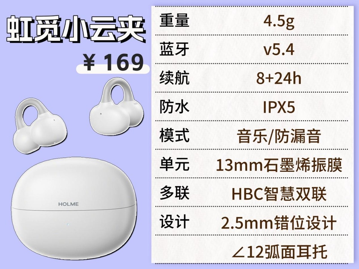 这款耳机的听感真的没得挑,声音清透又自然,空间音效做得特别地道,听歌时氛围感直接拉满。石墨烯发声单元是真材实料,可不是噱头,音质细腻度直接拉上来了,歌曲里那些容易被忽略的小细节都能听得清清楚楚。佩戴这块也完全不用操心,弧面耳托的电池设计,搭配虹觅专门调校的错位造型,和耳型贴合得恰到好处,戴着手感特别稳。就算运动时甩头、跑动,也半点不松动晃悠,运动党闭眼冲都没问题。