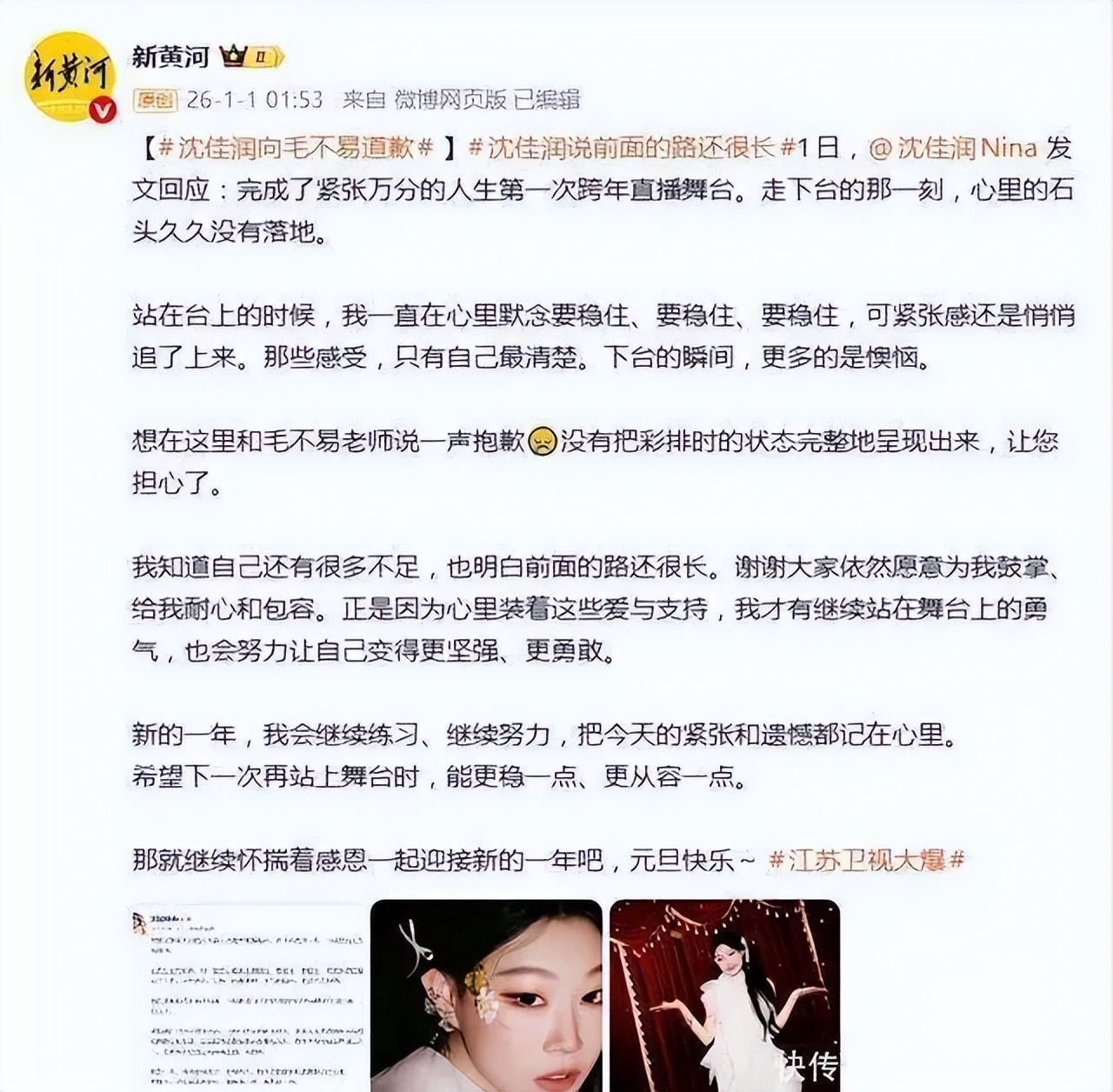 小沈阳的全力托举、毛不易的暖心救场、网友的包容态度,都是基于 “给新人成长空间” 的善意,这次的争议不是终点,而是一次对沈佳润成长路上的拨正。