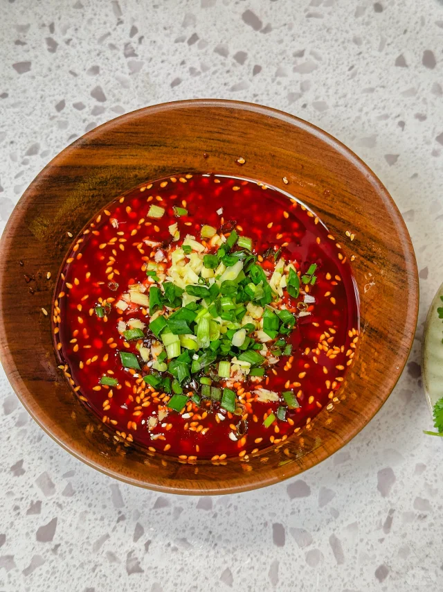 4、小勺子来四勺蒜水 、2勺辣椒油、2勺生抽、3勺醋、1小勺香油、少许的盐