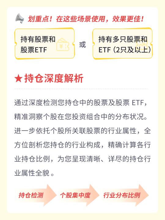 通过深度检测您持仓中的股票及股票 ETF,精准洞察个股在您投资组合中的分布状况。进一步依托个股所关联股票的行业属性,全方位剖析您持仓的行业构成,精确计算各行业持仓比例,为您呈现清晰、详尽的持仓行业属性全貌 。