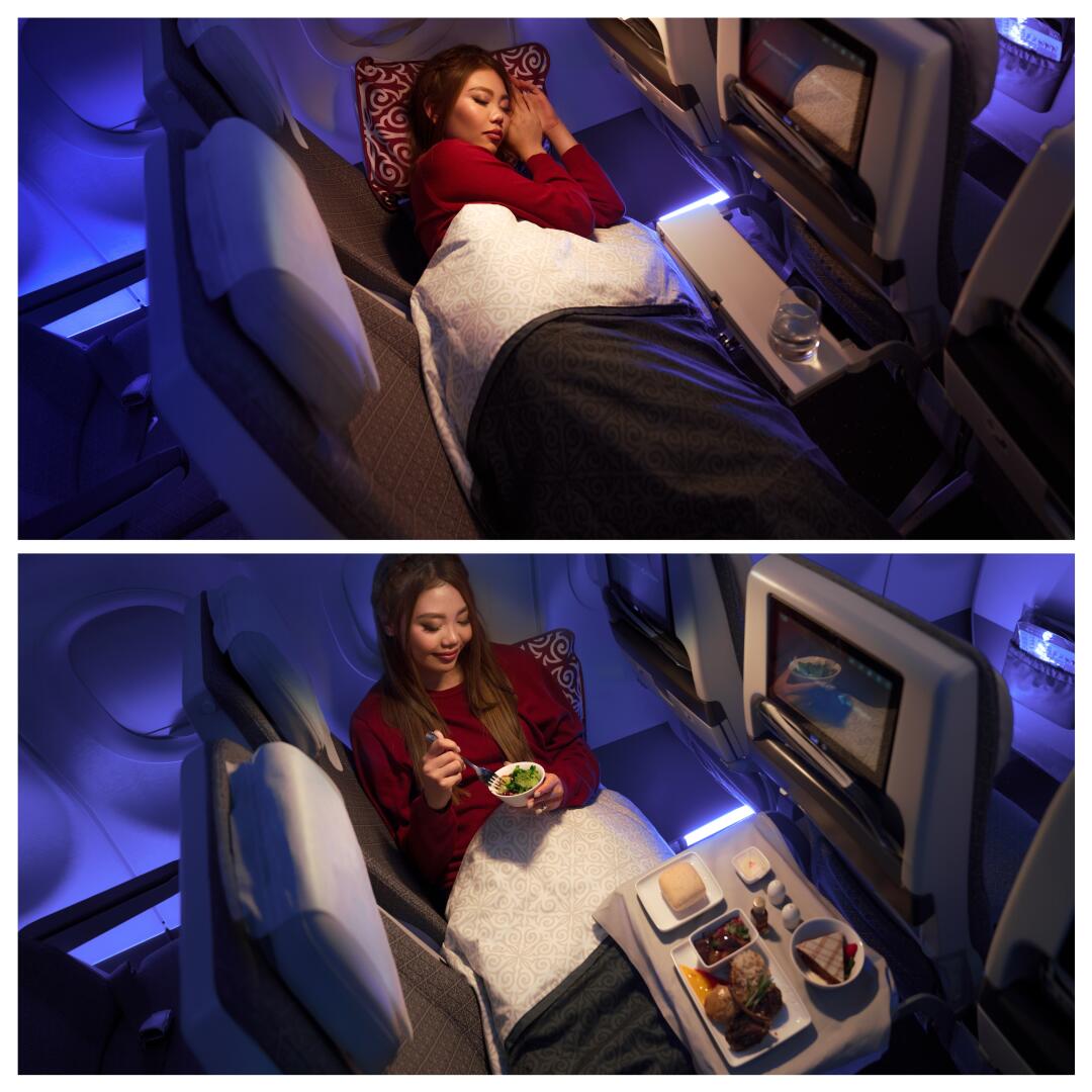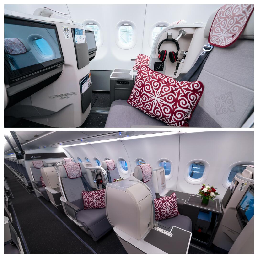 执飞阿斯塔纳航空中国航线的主力机型是A321LR,机队平均机龄仅2.6年,配置有16个商务舱座位,这16个座位中的其中4个是一排两座,提供有额外的个人空间。而值得一提的是,A321LR商务舱的座位是采用的全平躺式座椅,这在窄体客机中并不多见。而对于5,6个小时的航程来说,能够全平躺休息解除疲劳,真是太加分了!