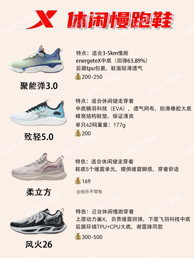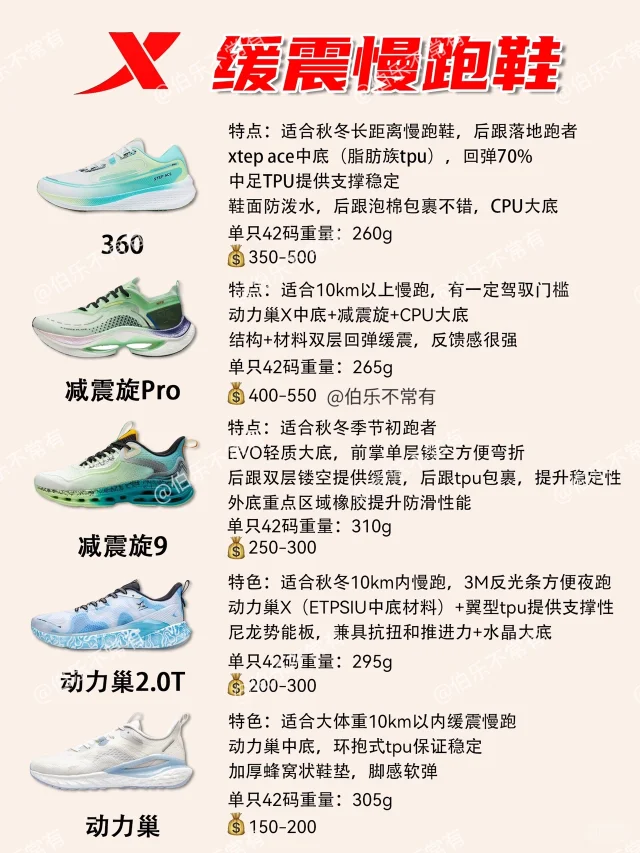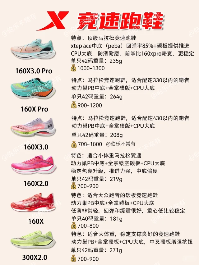伯乐根据特步跑鞋的中底科技,动力巢➡️动力巢X➡️动力巢PB➡️Xtep Ace(回弹越来越好),结合使用场景,将其划分出4大类[哇R]