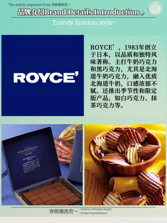 从意大利的Venchi到日本的ROYCE',都以精湛工艺和独特风味著称。这些品牌不仅注重原料的精选,更在制作工艺上追求更好,每一块巧克力都是艺术品。它们带来的不仅是味蕾上的享受,更是一种文化和情感的传递。无论是作为礼物还是自我犒赏,都能给人带来满满的幸福感和高品质的生活体验。