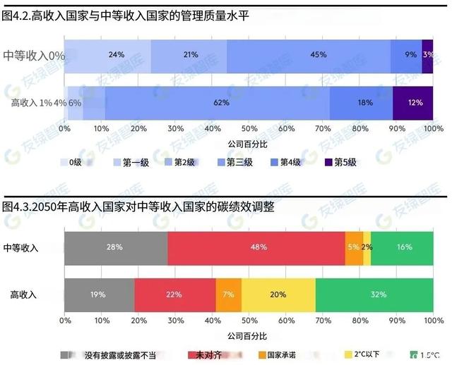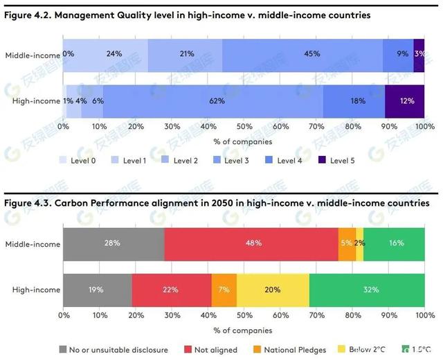 转型路径倡议组织基于世界银行的数据将不同国家分为高收入组别和中等收入组别,衡量其碳管理质量和碳绩效的表现。高收入组别国家有30%位于碳管理质量的第四级和第五级,而中等收入组别国家的这一比例为12%。32%的高收入组别国家将在2050年实现符合1.5摄氏度升温目标的脱碳轨迹,而中等收入组别国家的这一比例为16%。转型路径倡议组织研究发现,国家气候法规、碳定价制度、碳价格、气候战略、气候信息披露等因素均会对其企业的碳管理质量和碳绩效产生显著影响。