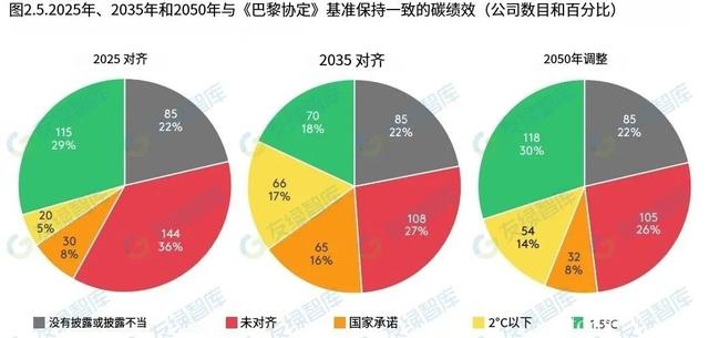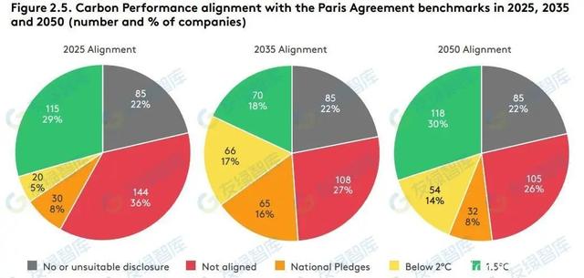 为了衡量企业排放轨迹与巴黎协定的一致性,转型路径倡议组织评估了超过400家高碳排放企业在2025年、3035年和2050年的碳绩效,以便比较短期、中期和长期的碳排放目标。从长期来看,企业的脱碳轨迹符合巴黎协定1.5摄氏度升温目标的占比最高,达到30%。2025年有36%的企业不能实现符合巴黎协定的升温轨迹,这一数值在2035年下降至27%。从行业角度分析,短期内的航空行业和长期的汽车行业的脱碳轨迹最符合预期。