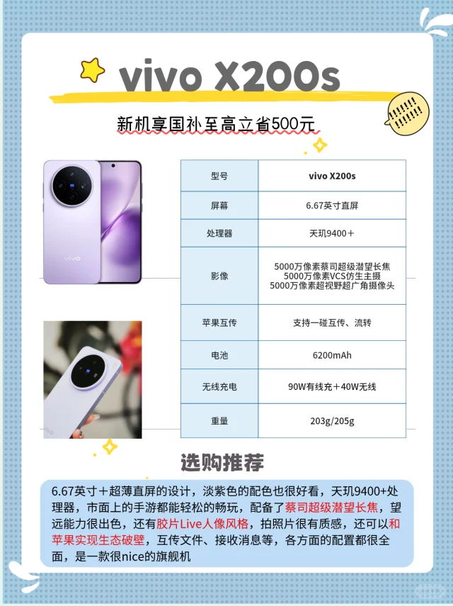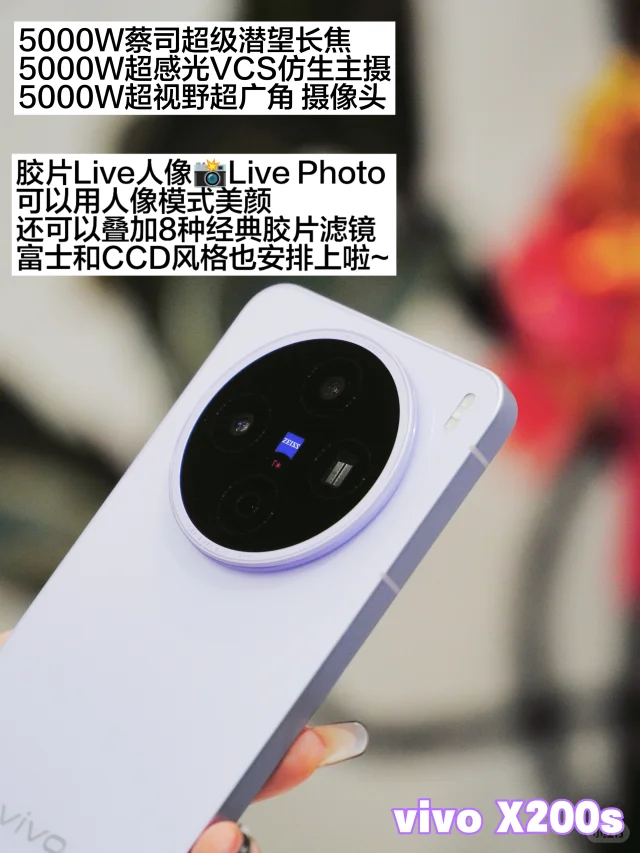 如果平时对影像要求高😏,X200s的5000万蔡司三摄+蔡司T*镀膜以及超感光主摄都很妥,苹果转安卓?X200s直接入🤨