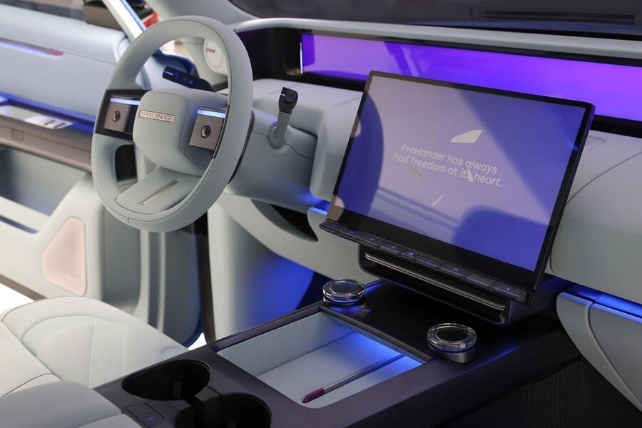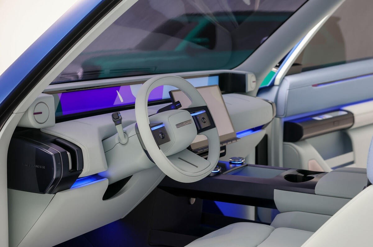 不过大家可以参考一下它的座舱设计,整体布局就和目前主流的新能源车差不多,座舱是极简设计,基本上没有实体控制按键,仪表盘被中控台前方的环形屏幕取代,同时保留了一块中控屏,整体没有太多新意。而值得一提的是,Concept 97将会使用创新的织物面料,座舱科技感很强,与路虎的档次感和豪华氛围有明显不同。