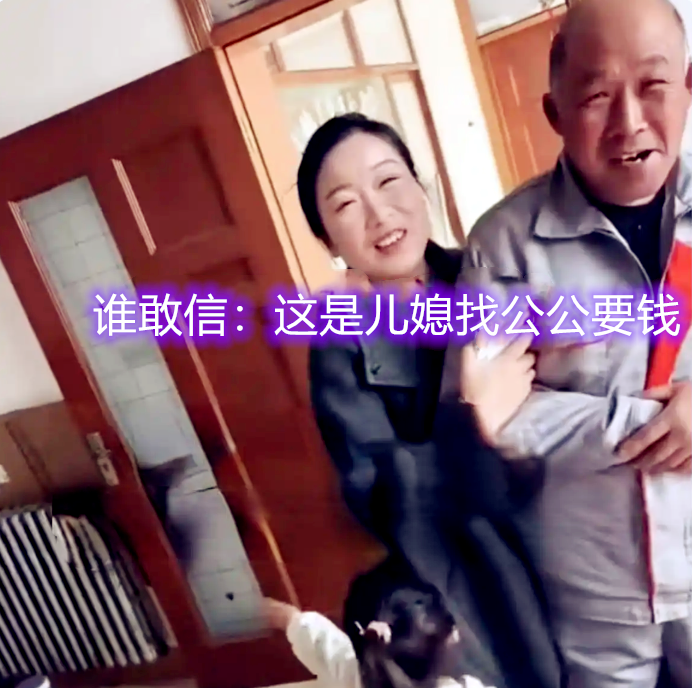 脸上还嘻嘻哈哈,非要公公给钱,公公也非常不愿意,但是脸上挂着笑容拒绝,说自己没钱
