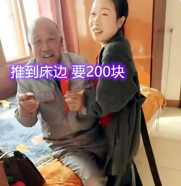 视频中女子带着女儿,拉住了公公的胳膊,非要公公给她200元,公公不愿意掏钱,所以就有点挣扎,结果女子直接搂抱住公公,还把公公逼到床边,公公只好坐到床边,女子怕公公跑了,直接用腿抵住公公