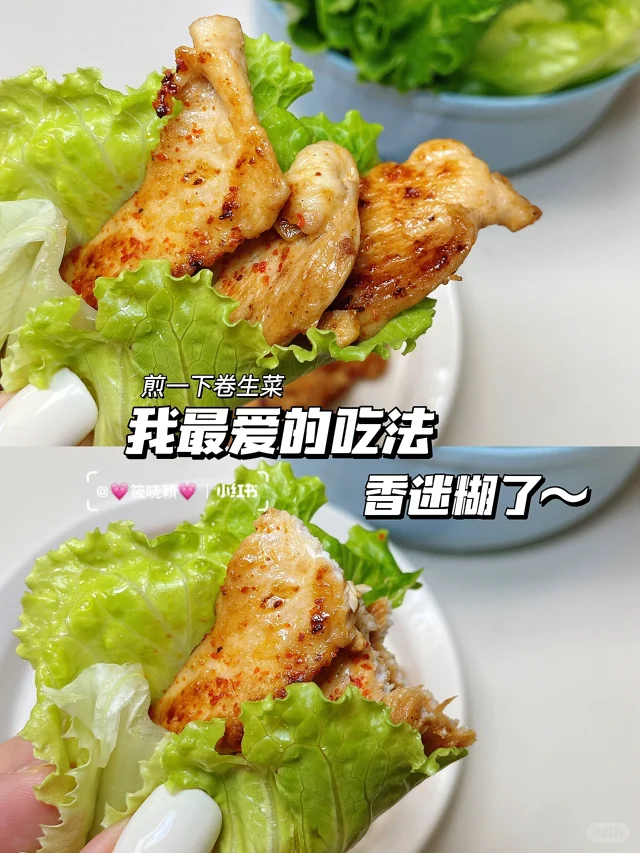 .🥬鸡胸肉放锅里煎一下,撒点辣椒粉卷着生菜,像吃烤肉一样快乐!真的巨好吃!