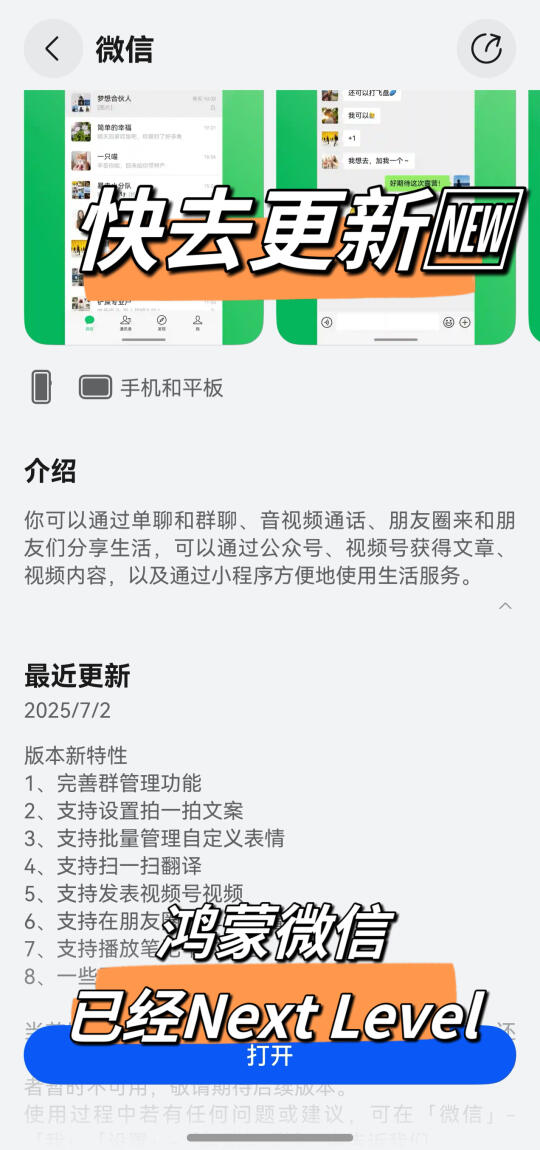 工作时推销电话轰炸,开会来电超尴尬,现在智能过滤,来电转文字留言,散会处理。上周赶方案,推销电话被拦截,沉浸式工作,专业度、效率起飞~ 鸿蒙微信又又又又更新了!最新版本已上架华为应用市场尝鲜区,此次升级新增:完善群管理功能、支持设置拍一拍文案、支持批量管理自定义表情、支持扫一扫翻译、支持发表视频号视频、支持在朋友圈分享和查看笔记等重要功能。