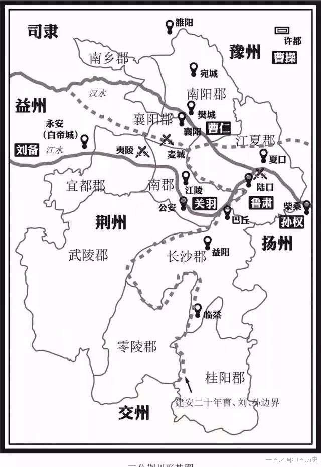 《三国志 吴主传》:权令诸葛瑾报,更寻盟好,遂分荆州长沙、江夏、桂阳以东属权,南郡、零陵、武陵以西属备。