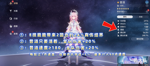 根据攻略大佬的测算,昔涟的拐力分为两种:变身前和变身后,变身前的昔涟只要在场上存在,她就能为全队增伤20%,当昔涟速度≥180时,还能额外增伤20%,而昔涟速度超过180后,每超过1点,自身冰抗穿透也将+2%(最多计入60点速度)。