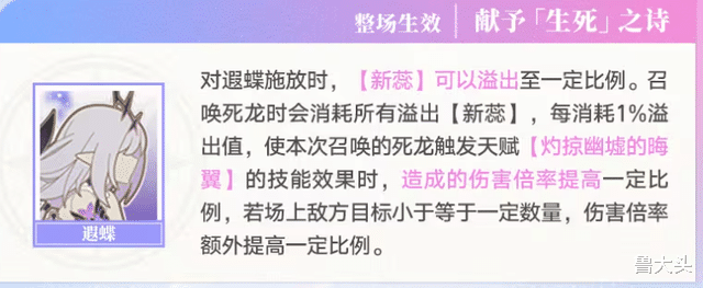 昔涟给黄金裔的BUFF都非常夸张,例如可整场生效的白厄,他在获得昔涟的BUFF后,将不会结束变身,能一直打下去。还有遐蝶,在获得BUFF后,她的“新蕊”可以溢出一定比例,这样不仅可以让死龙的伤害提升,也能缩短遐蝶再次释放大招的需求。