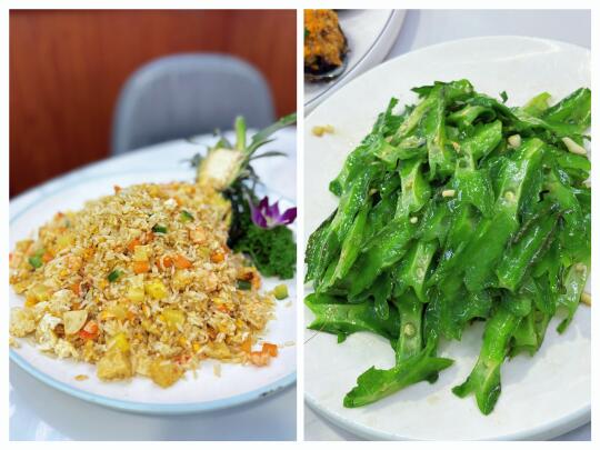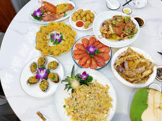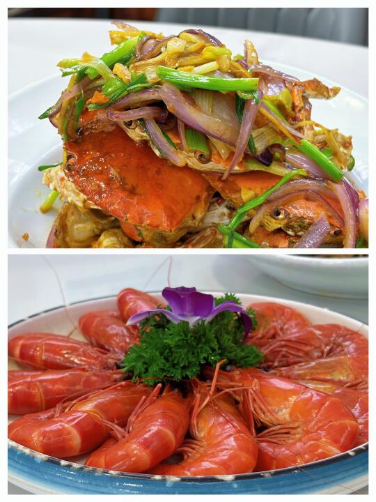 葱姜炒红花蟹还带膏,我就喜欢吃带膏的蟹盖。独家做的酱料炒的蟹入味,蟹肉鲜甜,太赞了。超大的白灼草虾蘸下店家调制的酱油,赞。还有粉丝蒸扇贝,一个个扇贝肉紧致饱满,好味。手工墨鱼丸好Q弹,食材新鲜,露露很喜欢。蔬菜就来个海南当地清炒四角豆,清脆爽口。主食点的是菠萝炒饭,量实在太大,浅尝了几口吃饱了。