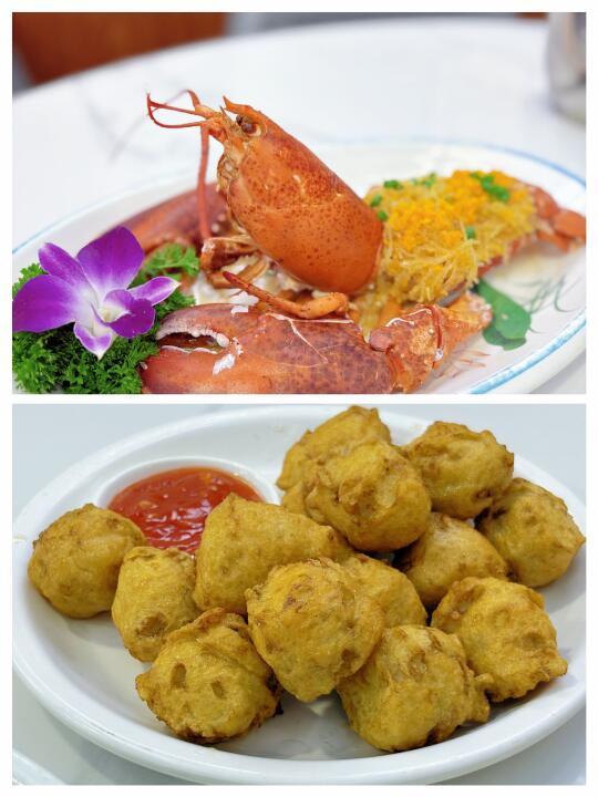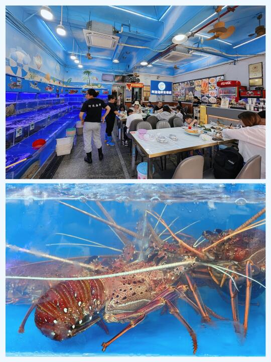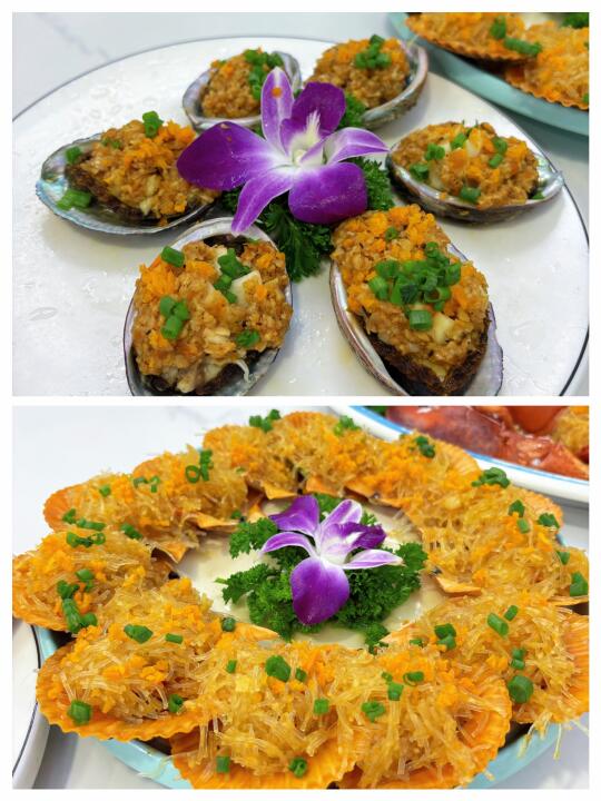 中午12点到,店里基本都坐满了。店里海鲜品种可选择的很多,龙虾、鱼类、贝壳类都有。我们点了8头鲍鱼,豆豉蒸的,都是大只的鲍鱼,肉质鲜嫩。期待已久的蒜茸粉丝蒸波龙好美味,特别是虾钳肉可以让服务员剪开,肉好多,鲜掉眉毛。