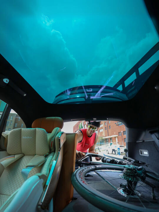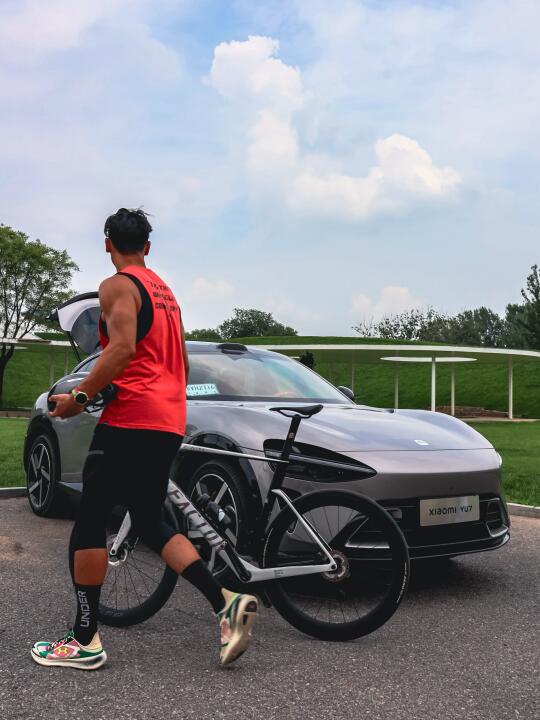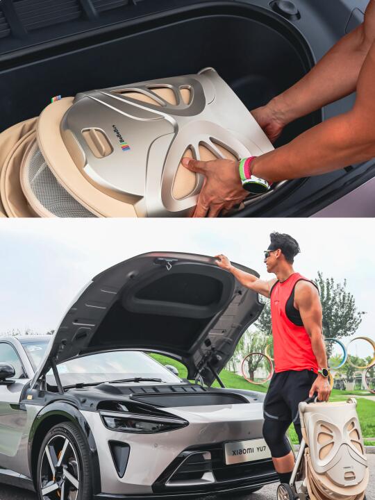 她是第一次坐小米YU7 Max 出门儿,因为后备箱放着我机动进山的巨型61码公路车,于是我把她的婴儿车放在了超级宽敞的前背箱里面