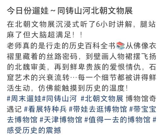 昨天又打着高铁去天津博物馆讲了一场《同铸山河》,谁让我对北朝瘾那么大那么上头呢[害羞R] 让我特别惊喜的是,昨天这场观众里有个特牛的小孩哥。四年级的娃,我讲到哪段历史背景,只要我一停顿,他就能绘声绘色咔咔往后接着续上了,还基本上都是对的。孩子讲的时候口齿伶俐,逻辑性强,一问他妈妈,小哥哥在鲁迅博物馆、国家自然博物馆都是小志愿者,那台风是相当稳健。 《同铸山河》北朝大展已经进入尾声了,不出意外的话,我7月18日还会再讲一次。难得有个把北朝历史比较完整铺陈开的展,且将且珍惜吧。