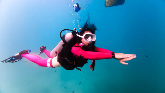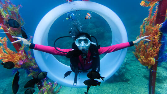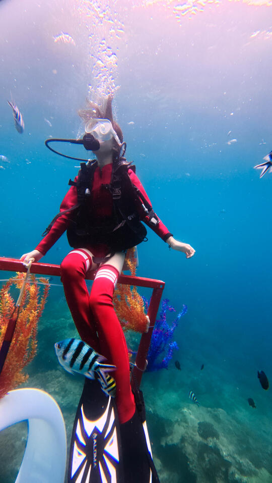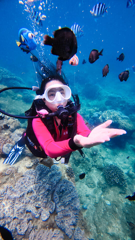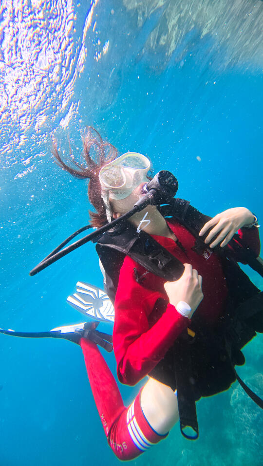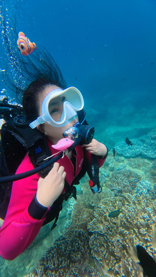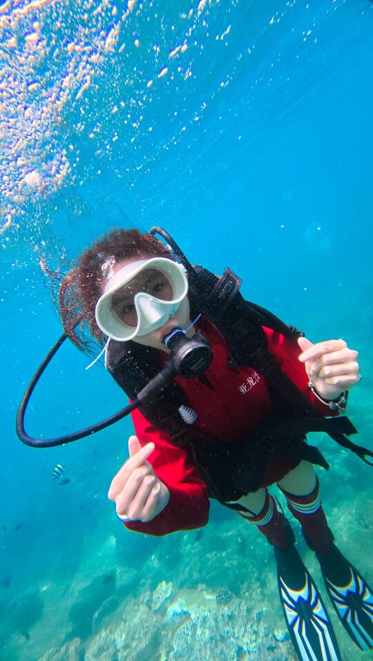 五年前我在三亚浮潜过几次,很喜欢。一直想尝试深潜,刚巧我们这次住在亚龙湾,附近就是太阳湾,潜水的好地方。 潜水最重要的就是找专业的团队,我选了三亚太阳湾辣条潜水俱乐部,定了798的套餐。进阶潜水全包,还可以玩浮潜、自驾动力冲浪板、摩托艇、香蕉船等。所有装备、深潜浮潜视频和照片全包,无二次消费。车程10分钟到太阳湾8号,工作人员让我们先换了泳衣,领我们去海边坐船去平台。首先到的就是浮潜区,我们迫不及待想潜水,直接去了下一个平台。 换好潜水衣后会安排一对一的潜水教练,背上装备戴上脚蹼,我的崔教练把我领到了海面。五年没有浮潜,一下子用嘴呼吸还不太习惯。适应之后他带我潜下去了,从开始1、2米到后来5、6米的深度,我越来越放松。我和露露在海底碰面了,她玩得也很开心,崔教练还帮我们拍了合影视频。教练教我好看的拍照动作,还要撒鱼食让鱼儿游过来,拍摄画面才好看。还要避开我呼出的水泡不能挡脸,拍照时要抬头,因为海底比较暗,学他教的动作和摆腿,我们都拍出了非常满意的潜水照片。 上岸后才知道,崔教练从业20几年了,教潜水和海底拍照拍视频都很专业,靠谱。玩了40分钟,我们已经对潜水上瘾了,事实证明找专业的潜水团队有多么的重要,下次还要玩。 小贴士 有刘海的宝贝记得用发夹夹住刘海,这样在水下刘海就不会飘起来影响出片了。