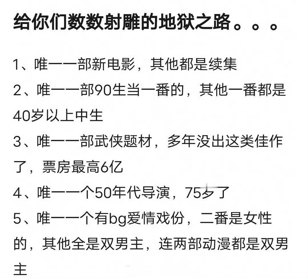 《射雕英雄传侠之大者》和春节档竞争对手相比: 《唐探1900》《哪吒2》《封神2》《熊出没N》都是续集电影,积累了大量粉丝,只有《射雕英雄传侠之大者》是新电影。 但《射雕英雄传》是金庸名著,几乎所有人都看过小说或者影视剧,所以也不算新IP,也不算太吃亏。而且徐克出品,必属精品。 再加上肖战的粉丝购买力强大,《射雕英雄传侠之大者》的预售票房不会比竞争对手差,甚至会好,我很期待。