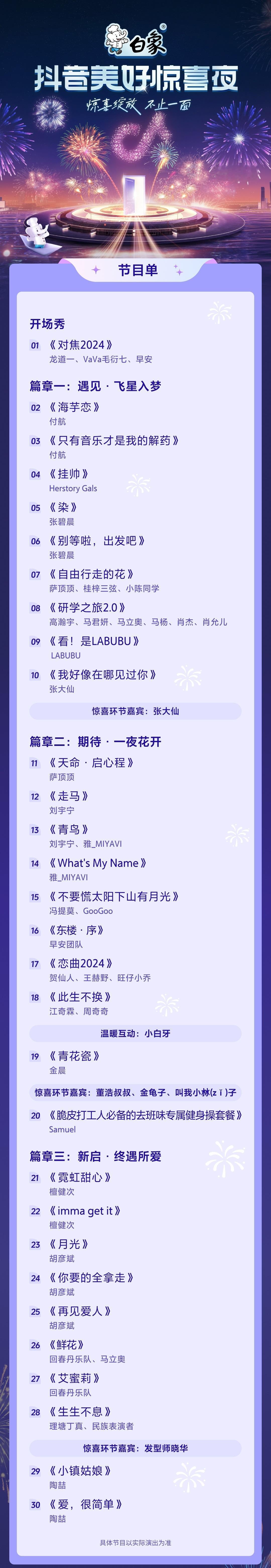 央视、湖南卫视、江苏卫视、东方卫视、浙江卫视、北京卫视、B站、抖音 8台跨年晚会的节目单来了,你会看哪一台? 湖南卫视、江苏卫视、东方卫视、浙江卫视是直播;其它都是录播。 华晨宇在湖南卫视压轴 李宇春在江苏卫视压轴 胡歌在东方卫视压轴 黄子韬在浙江卫视压轴(疑似)