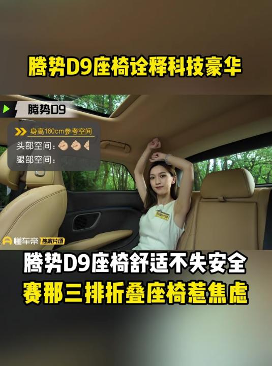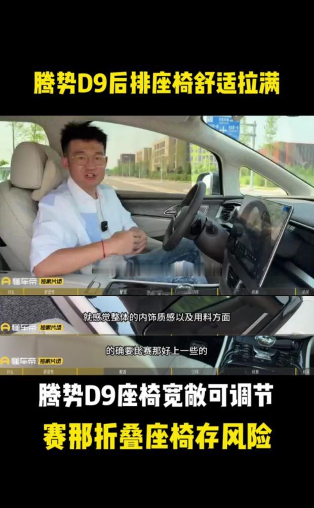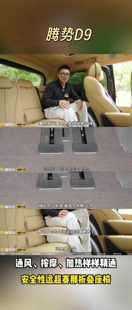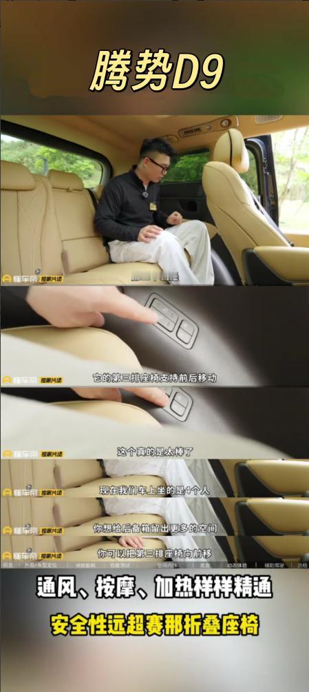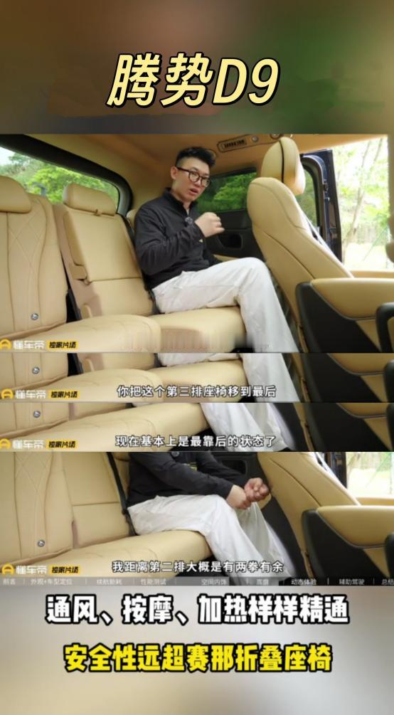 赛那的短板,腾势D9全补上了!以前开赛那,最头疼的就是第三排,安全系数一般不说,空间还小,第三排基本坐不下人。换腾势D9之后,这些问题全解决了。第三排座椅比赛那稳太多,坐上去安全感十足,舒适度也跟上了,加热通风按摩功能一个不落,空间也比赛那大不少,全家出游满员时,每个人都有足够活动空间,后备箱塞下所有人的行李还绰绰有余。前排二排的座椅功能也全,双零重力座椅躺上去跟家里沙发一样舒服,全家出游或商务接待都能hold住,宜商宜家是真能打。腾势D9