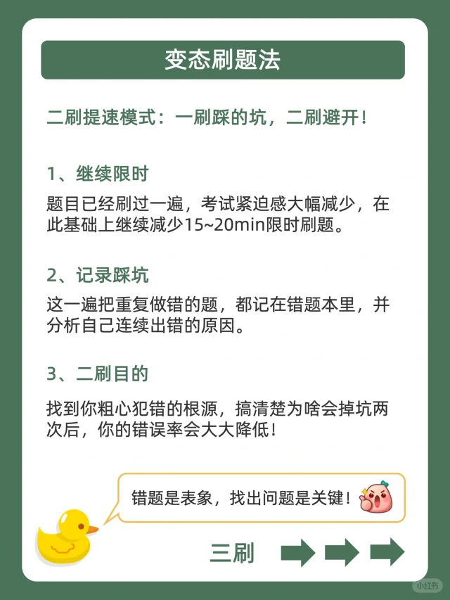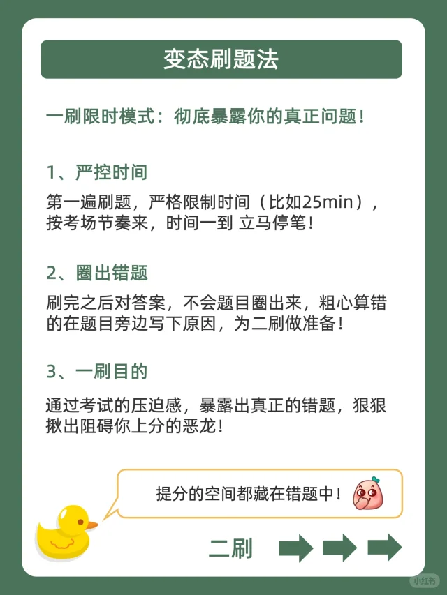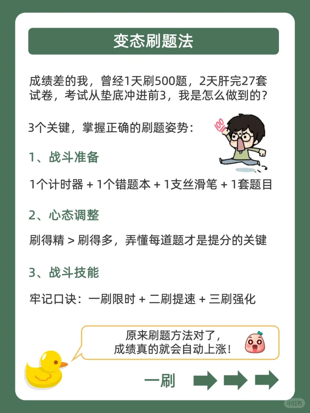 . [赞R]刷题摆烂不用怕,鸭鸭带你做学霸❗ . [向右R]有同学说问鸭鸭自己刷题低效又拧巴怎么办?[石化R] . [飞吻R]鸭鸭这么宠粉,肯定会提高你的刷题效率的哇![赞R] . 今天就来分享,变态刷题法,让你刷1道 = 别人刷5道!从此高效刷题,逆袭学霸![赞R] . ️🐣我是鸭鸭,持续更新优质学习方法,陪宝子们逆袭学霸,驰骋学海!🌊