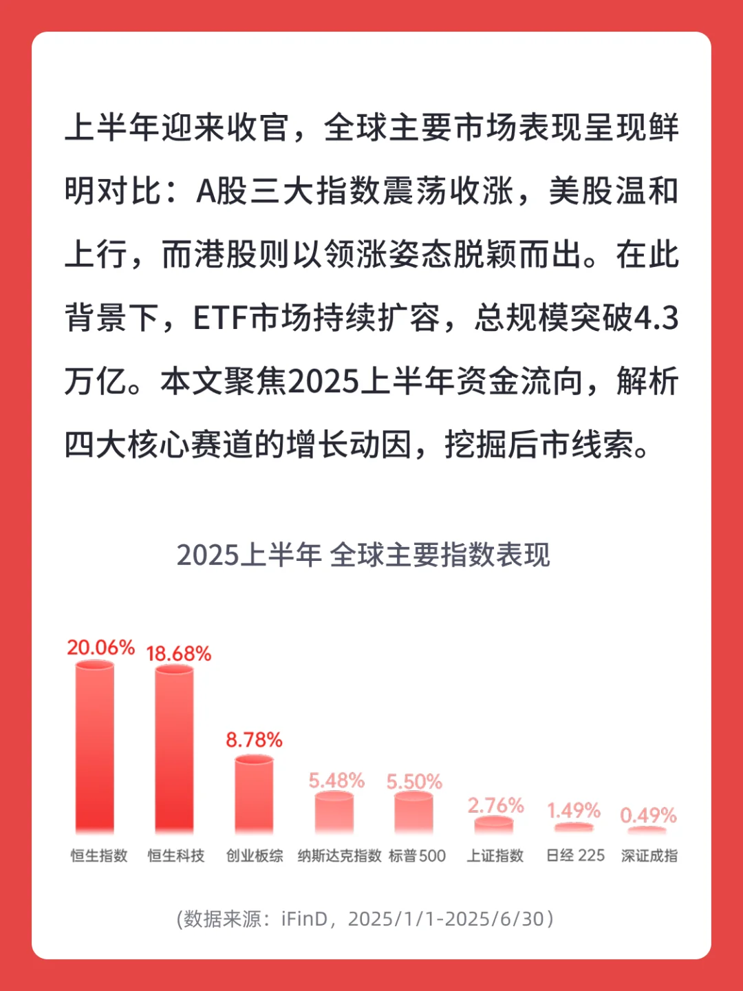 上半年迎来收官,全球主要市场表现呈现鲜明对比:A股三大指数震荡收涨,美股温和上行,而港股则以领涨姿态脱颖而出。在此背景下,ETF市场持续扩容,总规模突破4.3万亿。本文聚焦2025上半年资金流向,解析四大核心赛道的增长动因,挖掘后市线索。