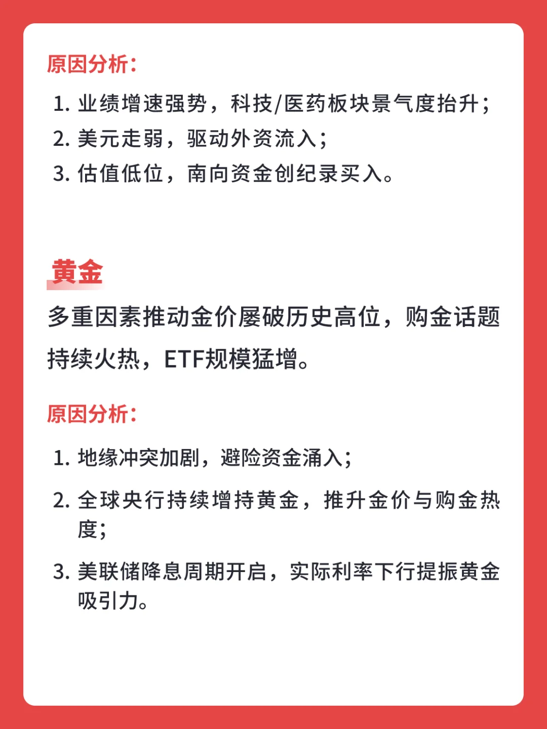 原因分析:1.地缘冲突加剧,避险资金涌入;2.全球央行持续增持黄金,推升金价与购金热度;3.美联储降息周期开启,实际利率下行提振黄金吸引力。
