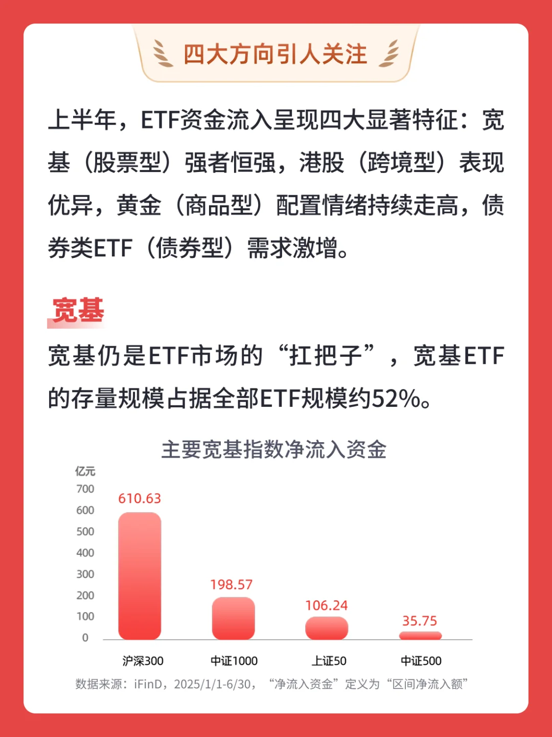 上半年,ETF资金流入呈现四大显著特征:宽基(股票型)强者恒强,港股(跨境型)表现优异,黄金(商品型)配置情绪持续走高,债券类ETF(债券型)需求激增。