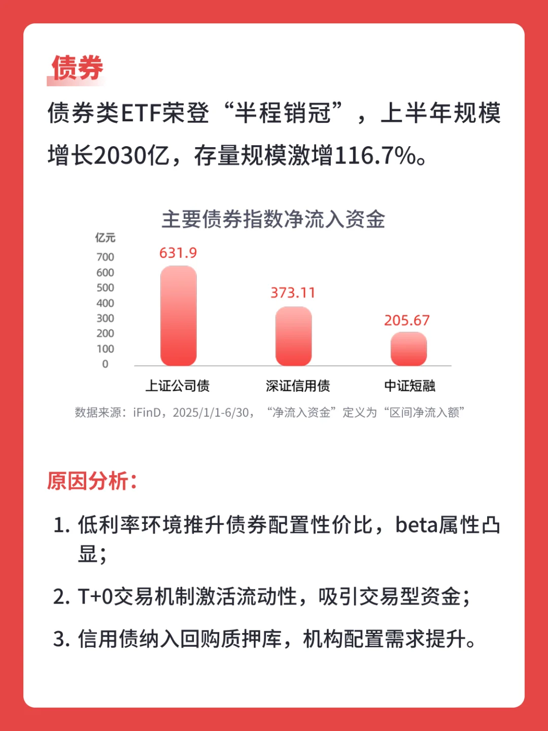 原因分析:1.低利率环境推升债券配置性价比,beta属性凸显; 2.T+0交易机制激活流动性,吸引交易型资金;3.信用债纳入回购质押库,机构配置需求提升。