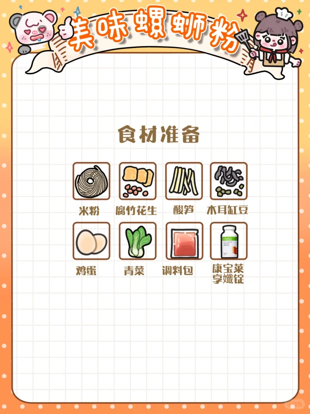 米粉|腐竹花生🥜|酸笋|木耳缸豆|鸡蛋🥚|青菜🥬|调料包|康宝莱享孅锭