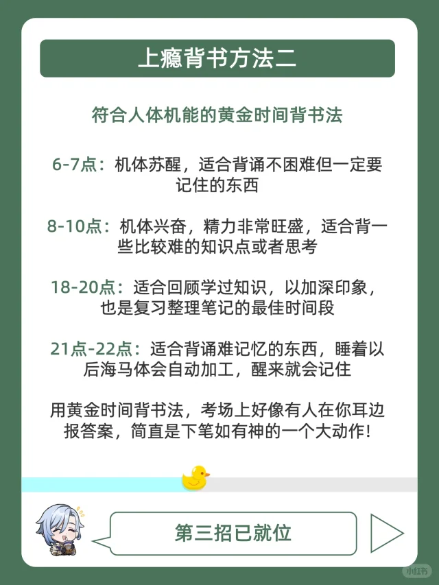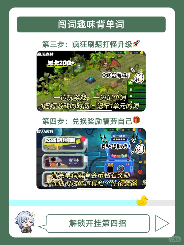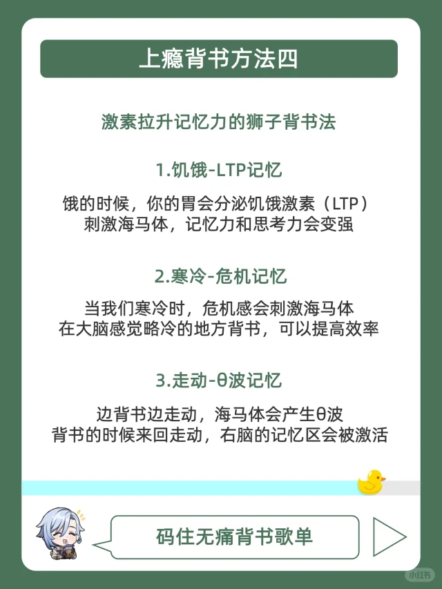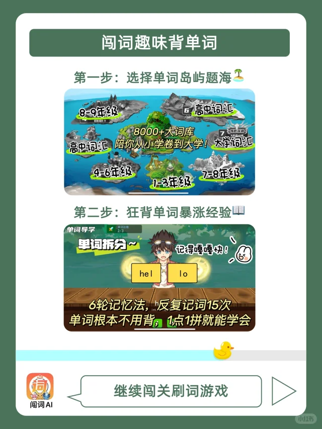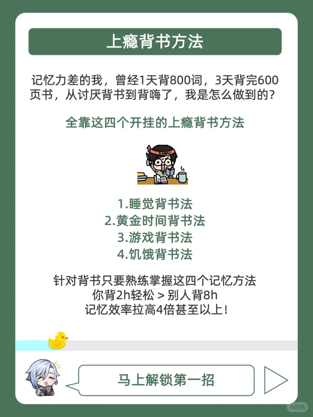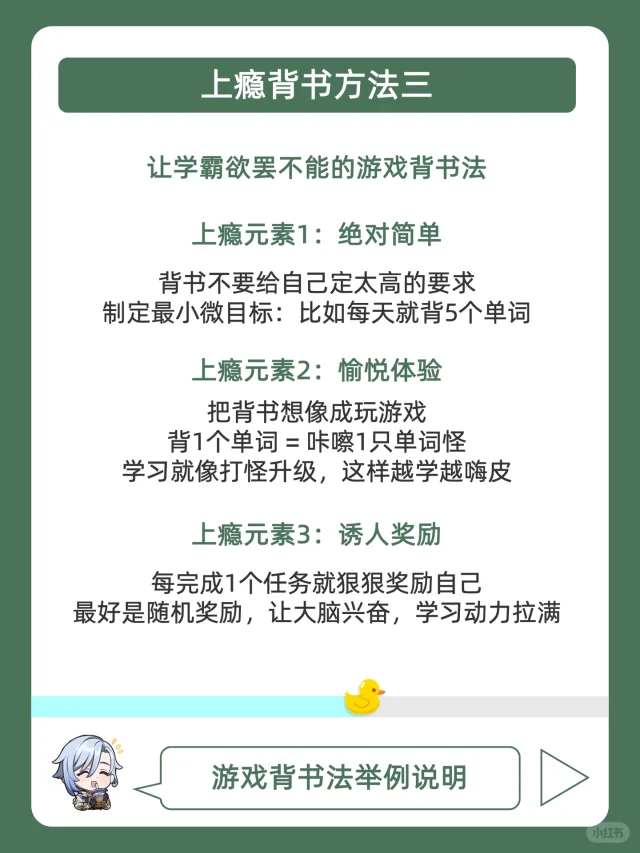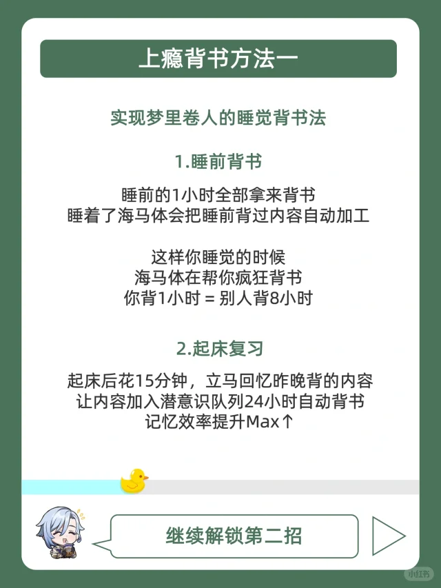 · [赞R]背书摆烂不用怕,鸭鸭带你做学霸❗️ · [哇R]拿下这4个变态背书方法,记忆力开挂就在于此!🚀 · [飞吻R]碎片时间再用闯词APP趣味背单词,背书就像玩游戏,学习娱乐双丰收![庆祝R] · ️🐣我是鸭鸭,持续分享更多优质学习方法,陪宝子们快乐学习,驰骋学海!🌊