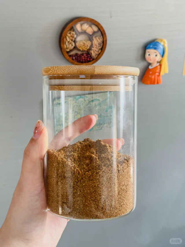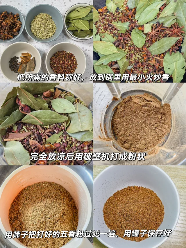 昨天看美食纪录片,刚好看到有大厨教自己在家做五香粉 这是我家常备的香料,炒菜炖肉都会用到的,今天立马行动,自己炒料,用破壁机打粉,这个香味超纯超正!,比外面买的浓郁好多啊! / 材料: 花椒100g,小茴香100g,八角150g,桂皮50g,丁香15g,香叶10g / 做法: 1.所有材料称好,放到锅里用最小火炒香 2.完全放凉后用破壁机打粉成粉 3.用筛子把五香粉过滤一下 4.用罐子密封保存 本地人才知道的灵魂调味无添加的香料自制五香粉