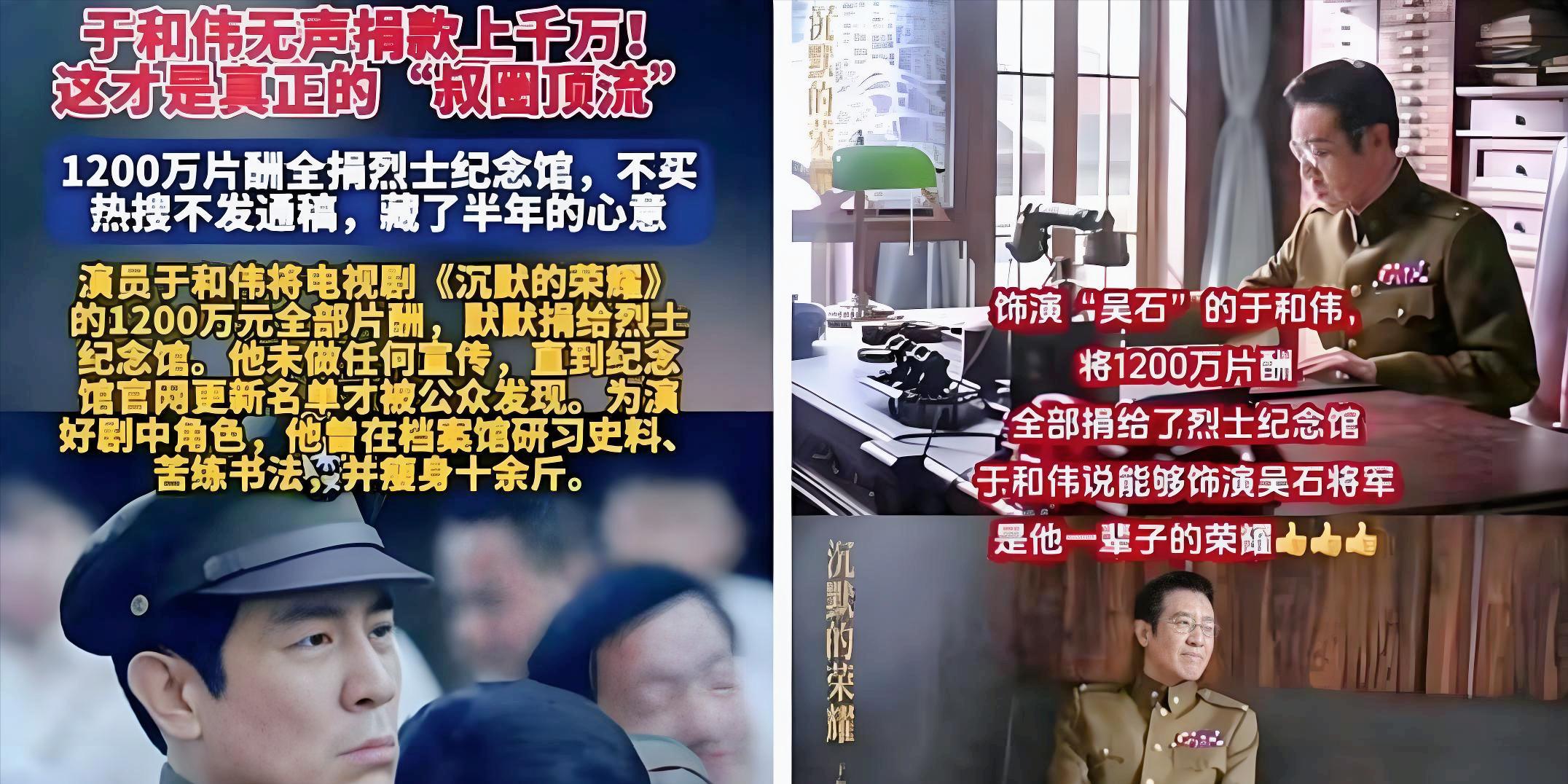 事情是这么传的:于和伟拍《沉默的荣耀》拿了1200万片酬,全捐了要给吴石将军建纪念馆,消息传得快,什么“纪念馆捐款名单更新了”,“他本人说这钱属于英雄”,网友一看,这演员有情怀啊,转发点赞刷起来