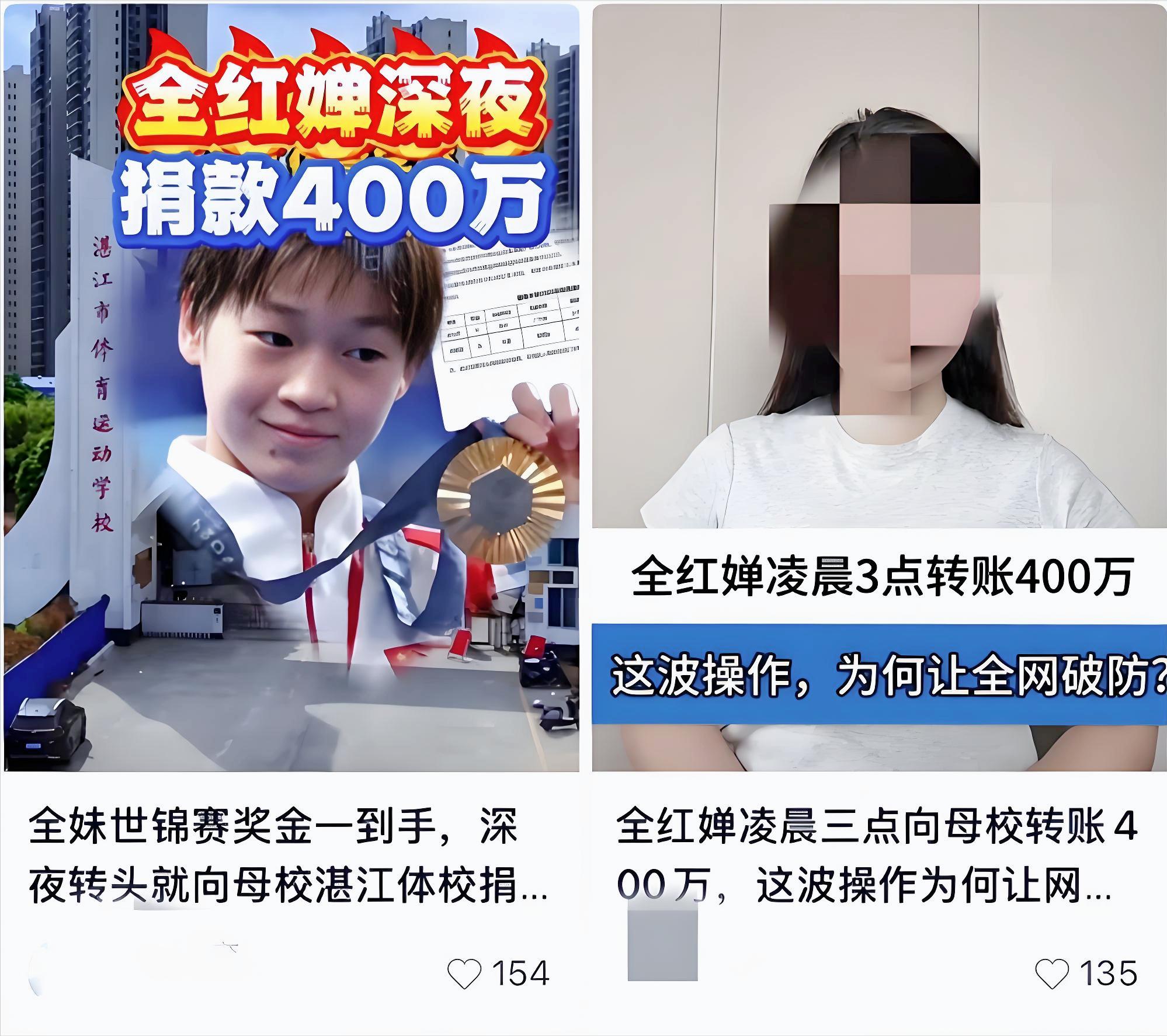 之前全红婵也中过招,今年5月网上传她捐了600万给母校湛江体校,说是要换跳水设备,细节编得跟真的似的,什么“凌晨三点转账”,“教练晒截图”,“护膝破了都舍不得换”