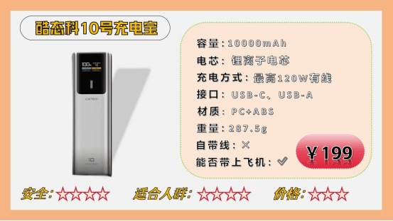 酷态科 10号充电宝主打高功率快充性能,支持最高 120W 输出,可为手机、平板甚至部分轻薄笔记本供电。电芯采用高密度动力电池,标称容量为 10000mAh,额定容量略低于同类 20000mAh 产品,但在体积和重量上更有优势。机身约等于一罐可乐大小,重量 346g,适合携带外出。